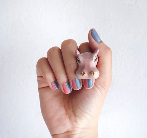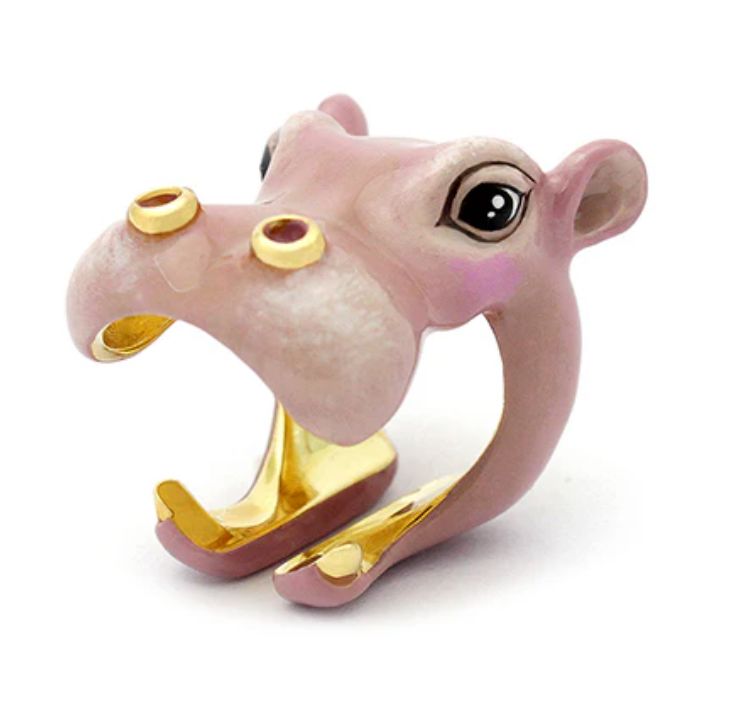Look out for the big Chomp when you wear this incredible hand made Hippo Ring. Hippos are large and are semi aquatic animals, with a large barrel-shaped body, short legs, a short tail and an enormous head. Love the way your finger goes through the wide mouth opening - such fun!