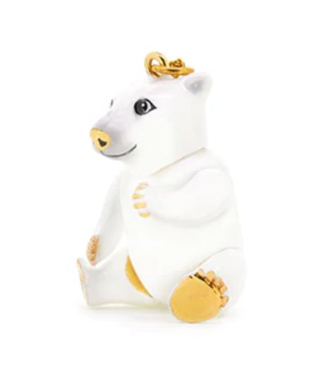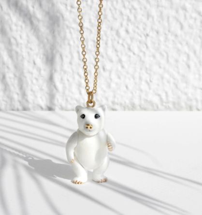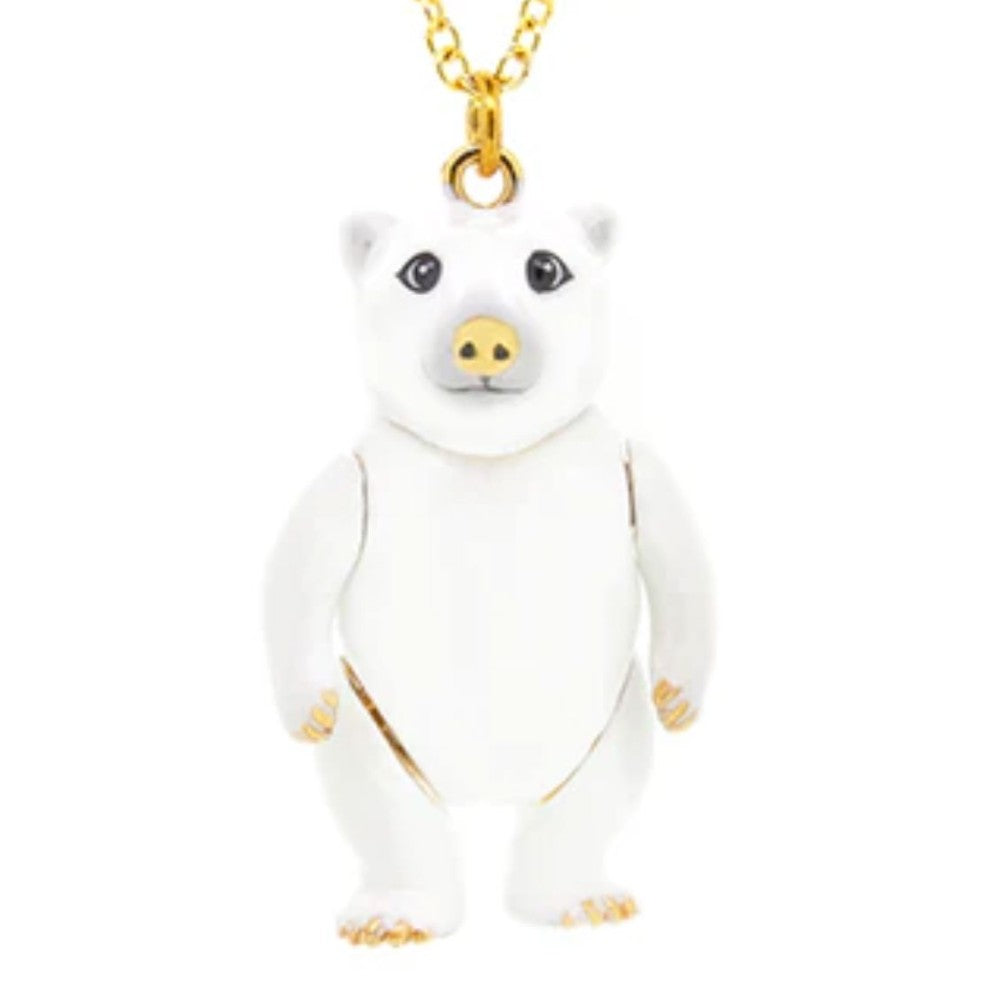 Check out this Polar Bear Articulated Necklace - hand-painted with a smashing gold nose! The largest bear in the world and the Arctic's top predator, polar bears are a powerful symbol of the strength and endurance of the Arctic. Did you know that the Polar Bear has a blue tongue, black Skin and transparent fur and 3 eyelids that help protect their eyes in the harsh elements?