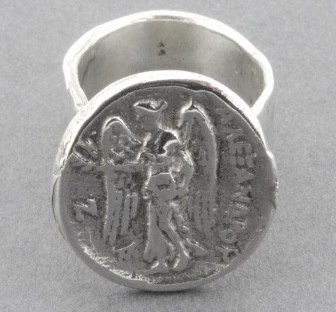 This expertly handcrafted sterling silver ring features a copy of a ancient coin, embodying a unique blend of timeless history and contemporary elegance with a beautiful Angel on its front. Its adjustable design ensures a perfect fit, making it a versatile accessory that complements any style. Meticulously crafted, this ring offers both durability and an exquisite finish, ideal for those who appreciate artisanal quality and cultural heritage in their jewellery.