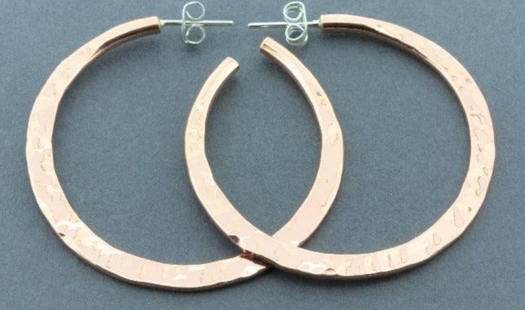 These Mexican Beaten Hoops showcase a refined hammered copper design that catches the light with a subtle glisten. Paired with durable sterling silver posts, they offer both comfort and lasting shine. Perfect for those seeking an elegant yet artisanal accessory that enhances any outfit with a touch of handcrafted sophistication.