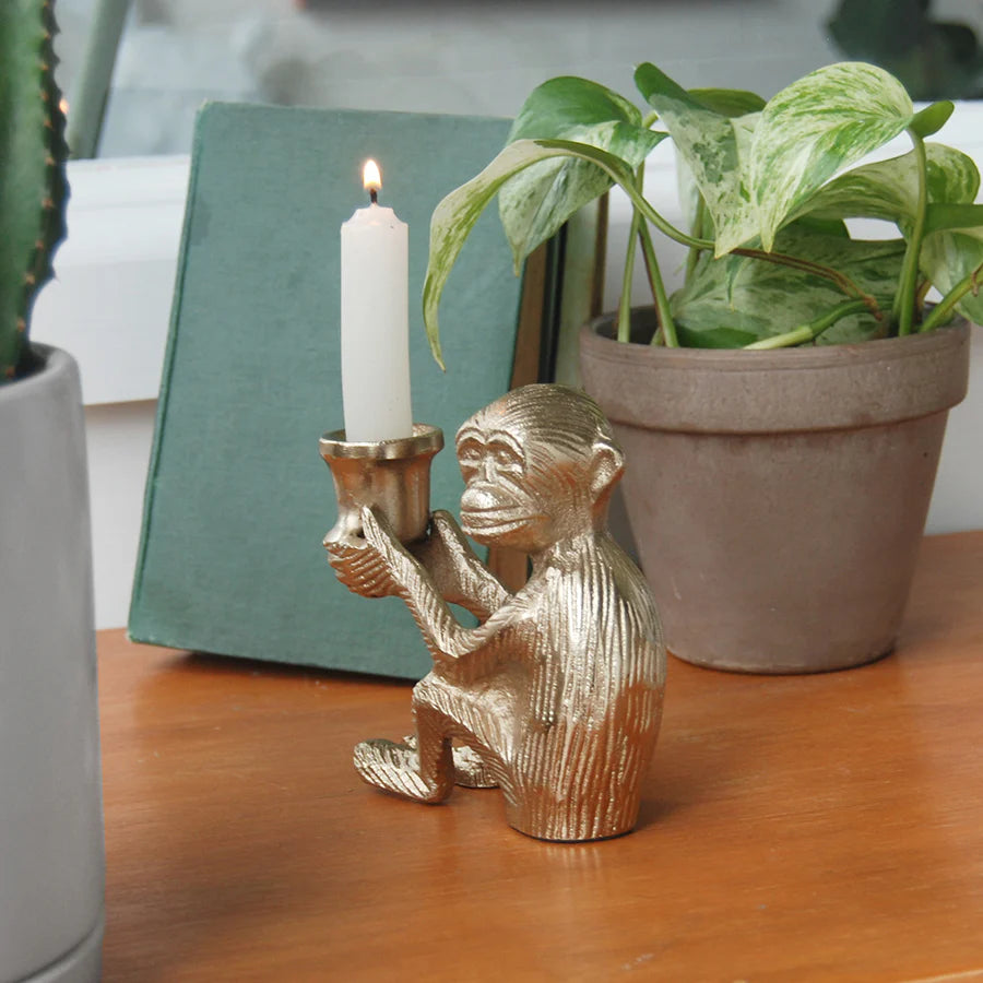 Elevate your styling with this charming monkey candle holder. The matte black finish/gold finish and sculptural form bring depth and sophistication, making it a standout addition to console tables, bookshelves, or bedside settings. Whether styled with vintage books, natural textures, or warm timber, this piece adds personality and a soft candlelit glow—perfect for eclectic, modern, and earthy interiors.
