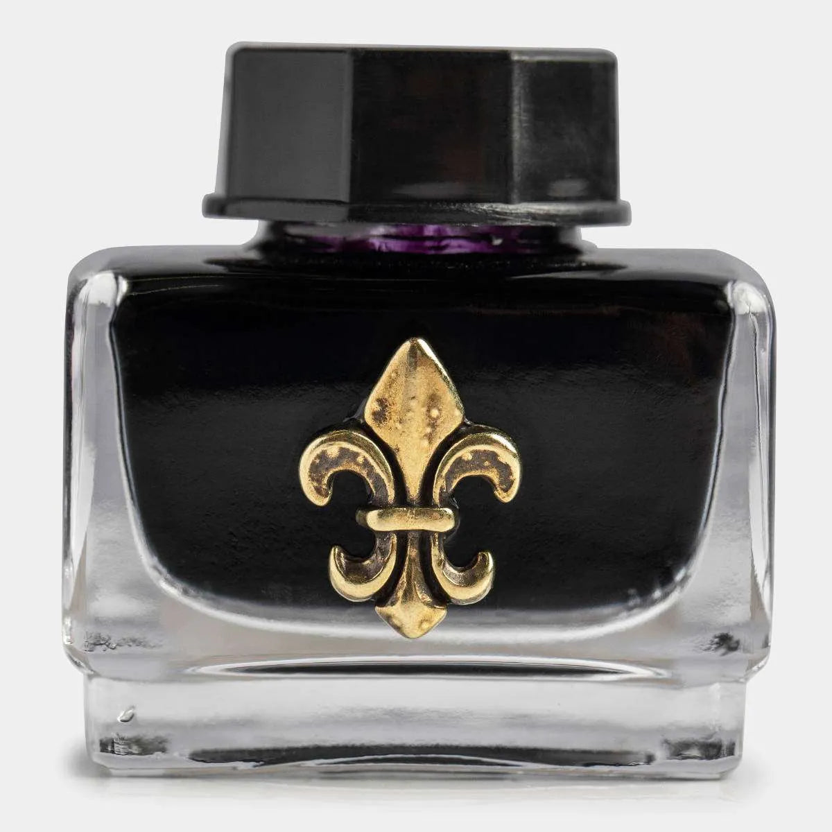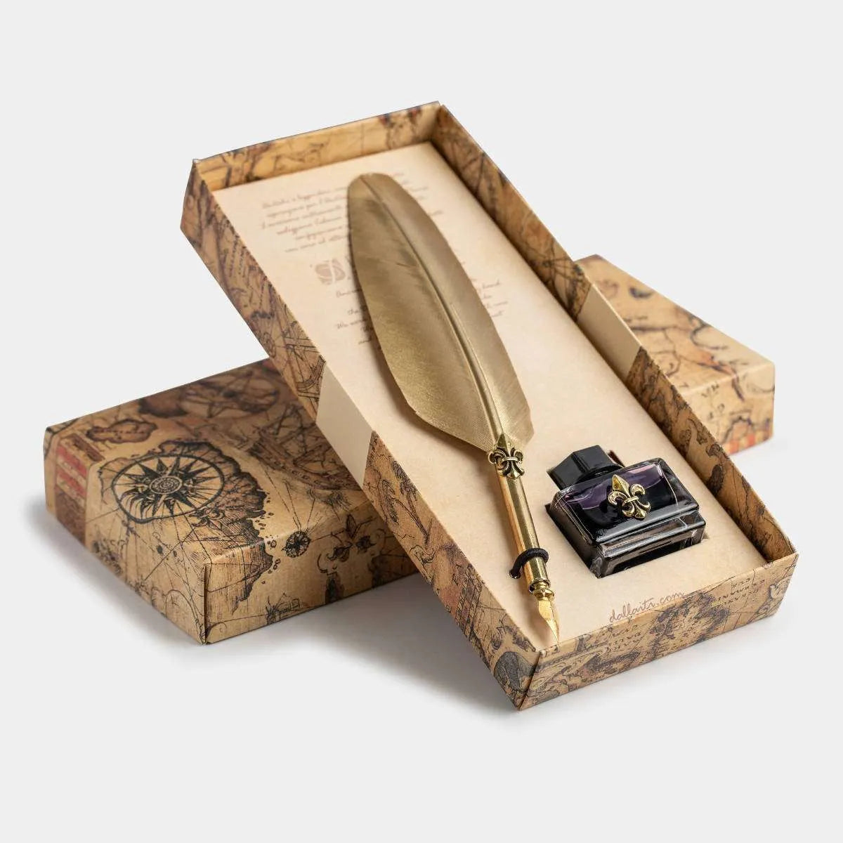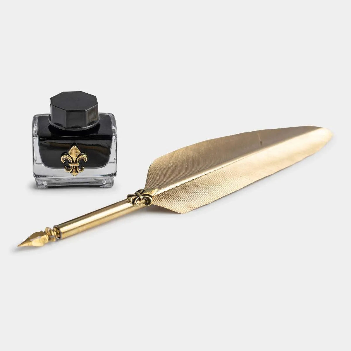 Writing Set with Feather Pen Decorated with Antique Gold Fleur-de-lis, Calligraphy Ink and Antique Gold Fleur-de-lis