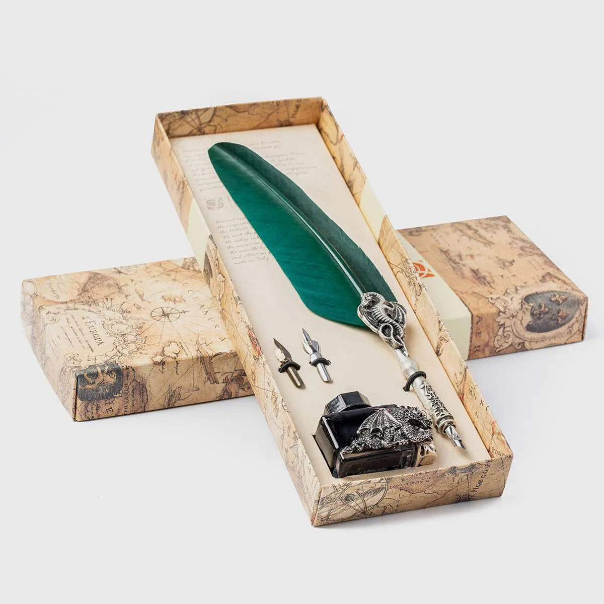 The set includes a 15ml black calligraphic ink bottle, 2 additional nibs and pen holder in decorated metal treated with antique silver attached to the ink bottle.